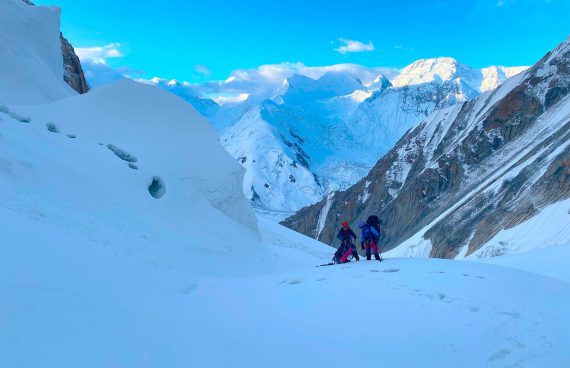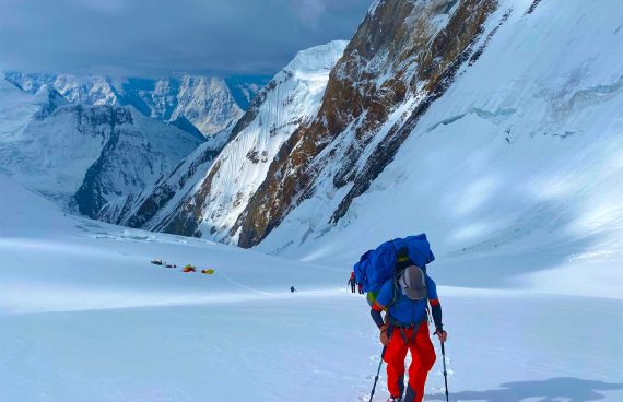Del Campo 2 subimos por las cuestas a la parte superior del circo glaciar de Semenovskiy hacia la confluencia de los picos Khan-Tengri y Chapaev.