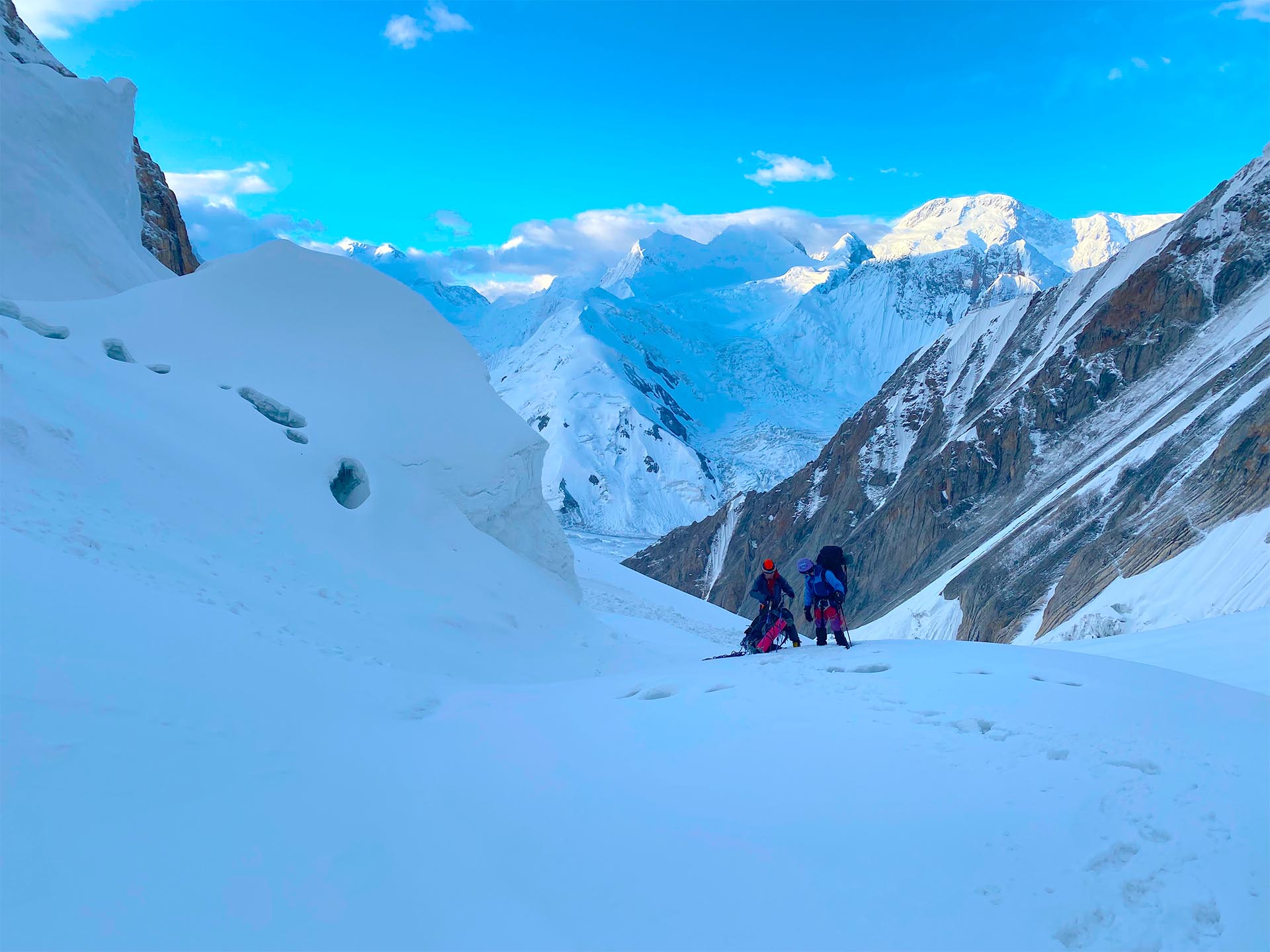 En la cresta hay unas plazoletas a las alturas de 6200m, 6400m y 6700m. Aquí si es necesario se puede montar el Campo 4, la llanura más cómoda es a la altura de 6400 m.